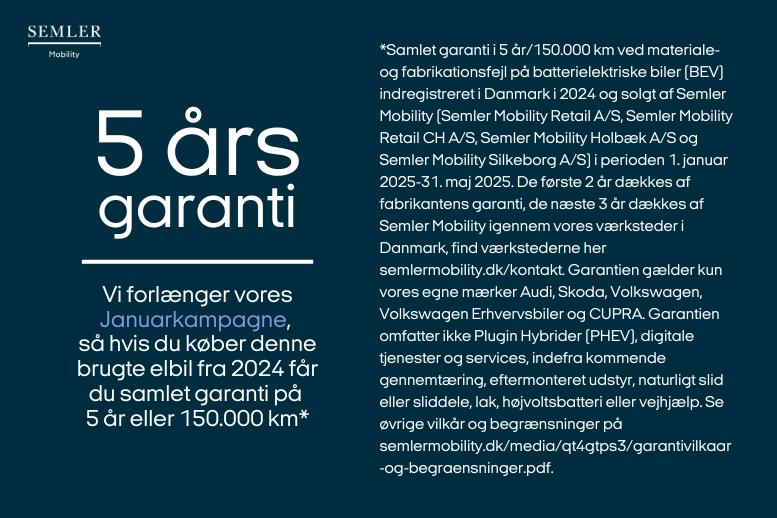 *Samlet garanti i 5 år/150.000 km ved materiale- og fabrikationsfejl på batterielektriske biler (BEV) indregistreret i Danmark i 2024 og solgt af Semler Mobility (Semler Mobility Retail A/S, Semler Mobility Retail CH A/S, Semler Mobility Holbæk A/S og Semler Mobility Silkeborg A/S) i perioden 1. januar – 31. maj 2025. De første 2 år dækkes af fabrikantens garanti, de næste 3 år dækkes af Semler Mobility igennem vores værksteder i Danmark, find værkstederne her www.semlermobility.dk/kontakt. Garantien gælder kun vores egne mærker Audi, Skoda, Volkswagen, Volkswagen Erhvervsbiler og CUPRA. Garantien omfatter ikke Plugin Hybrider (PHEV), digitale tjenester og services, indefra kommende gennemtæring, eftermonteret udstyr, naturligt slid eller sliddele, lak, højvoltsbatteri eller vejhjælp. Se øvrige vilkår og begrænsninger på https://www.semlermobility.dk/media/qt4gtps3/garantivilkaar-og-begraensninger.pdf